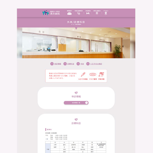 外来/診療科目ページは休診情報や診療科目などに変更があった際に、
