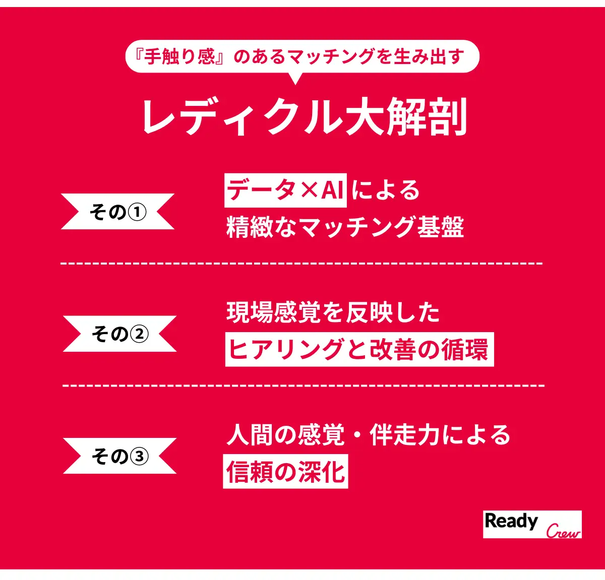 AIによる効率性と、人の感性が生み出す手触り。この二つのバランスを保つことこそが、レディクルのマッチング品質を支える中心的なテーマであり、未来を形づくる鍵となります。