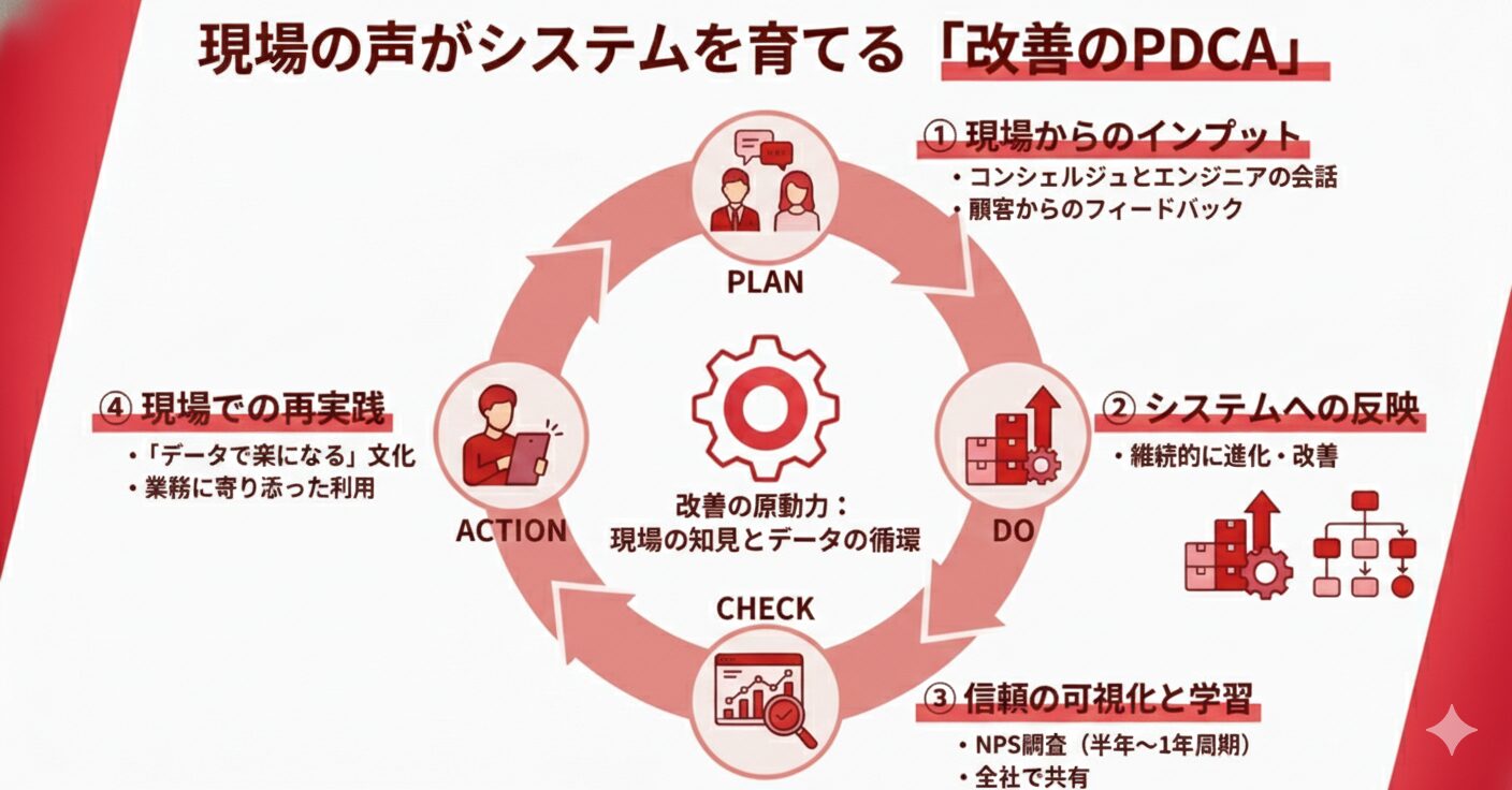 この「実践と分析によるフィードバックサイクル」こそが、コンシェルジュがより深くお客様に寄り添ったヒアリングを可能にする源泉です。現場の知見が絶えず仕組みに組み込まれることで、チーム全体の知識とスキルの底上げに直結しています。