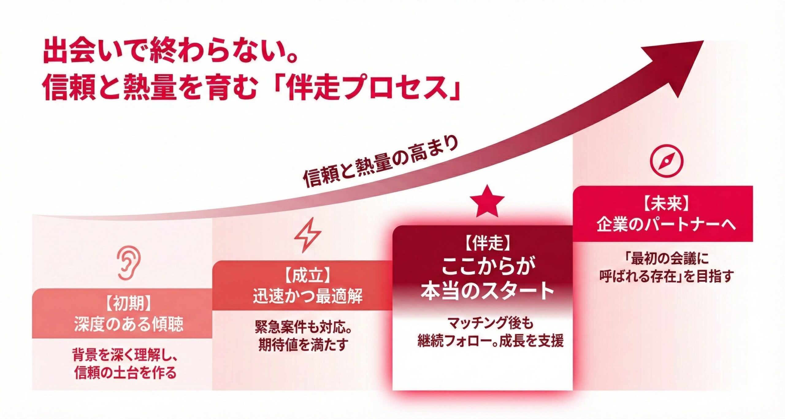 マッチング後は丁寧なヒアリングを行い、お客様の状況や成長フェーズに合わせて、次に必要な支援を一緒に考えながら伴走します。