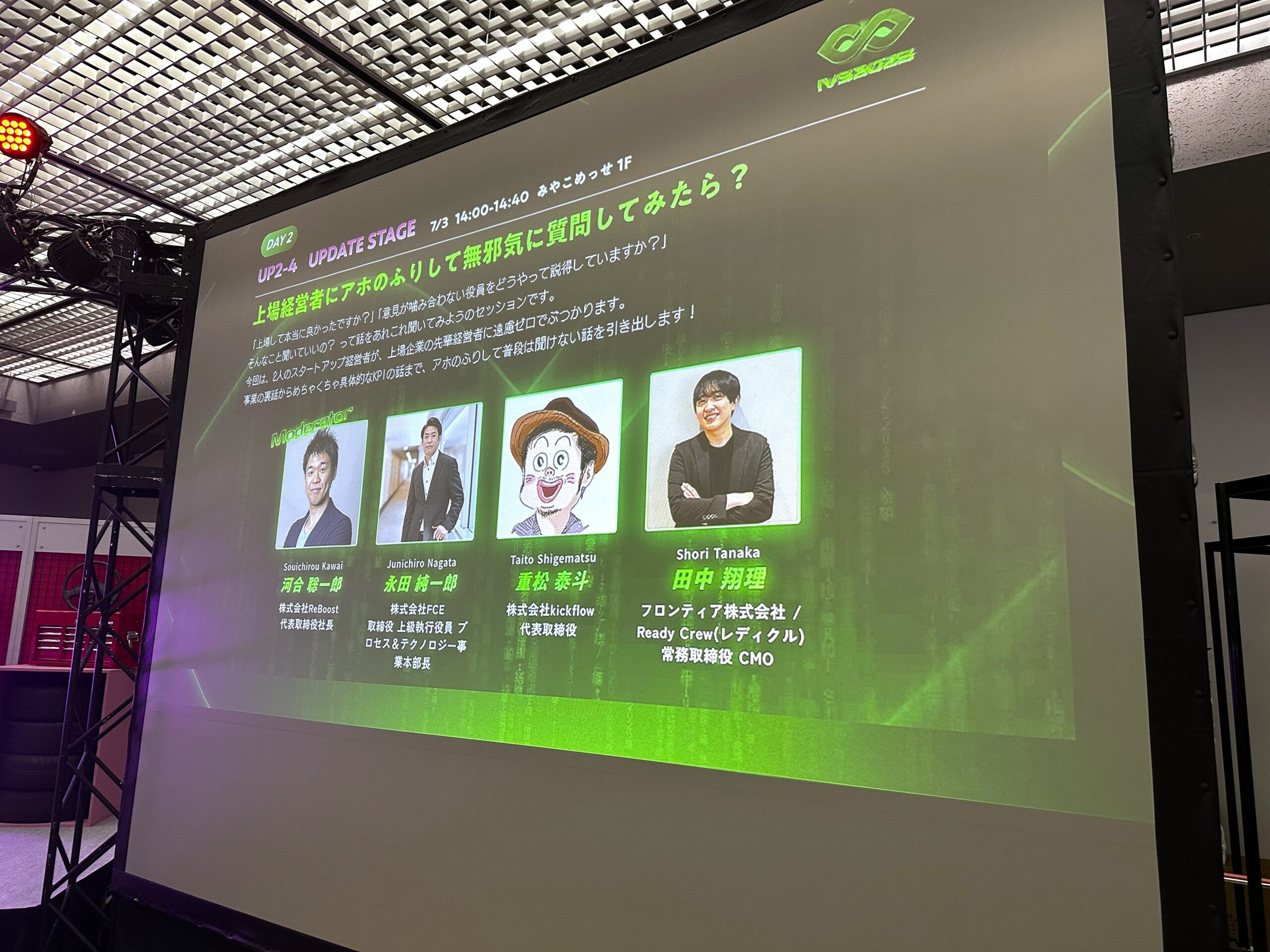 本セッションでは、『上場経営者にアホのふりして無邪気に質問してみたら?』と題し、株式会社kickflow 代表取締役・重松氏と当社 常務取締役CMO・田中のスタートアップ経営者2名が登壇。モデレーターとして株式会社ReBoost 代表取締役社長・河合氏を迎え、上場企業の経営者である永田氏(株式会社FCE 取締役・上級執行役員)に対し、「上場企業における若手の育成」や「IPO後の生活の変化」など、通常ではなかなか聞くことのできないテーマを”アホのふり”をして無邪気に質問する形式で、上場企業経営者のリアルな本音に迫りました。