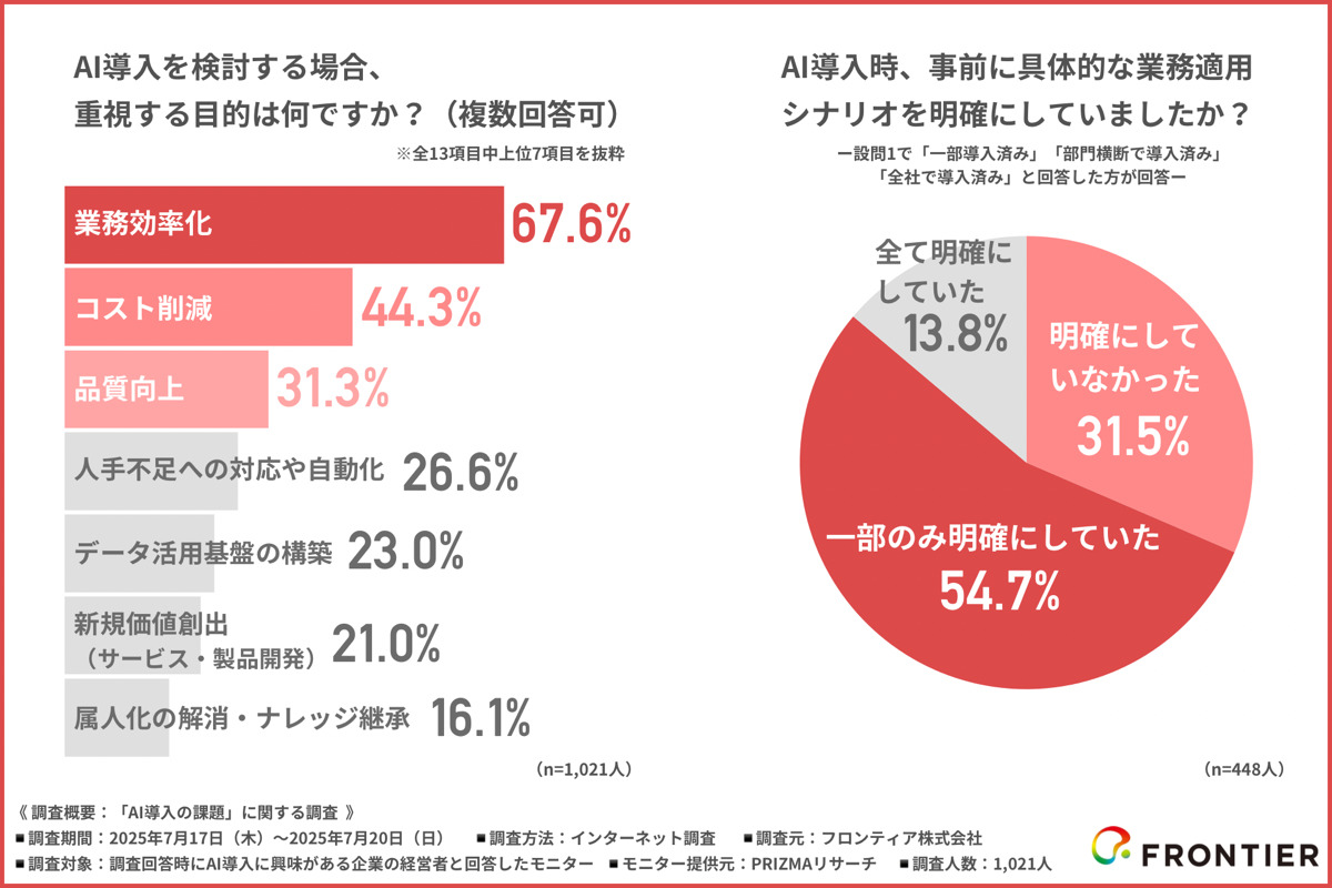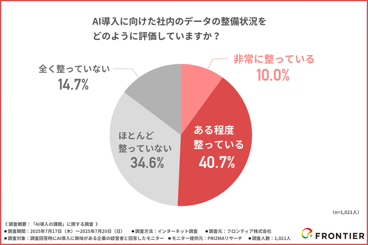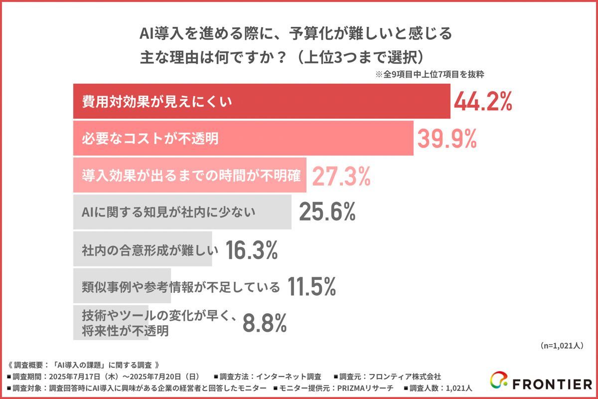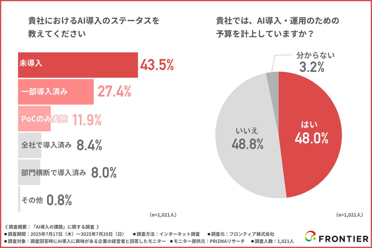 フロンティア株式会社(本社:東京都渋谷区、代表取締役社長:高橋 政裕)は、AI導入に興味がある企業の経営者を対象に「AI導入の課題」に関する調査を行いました。