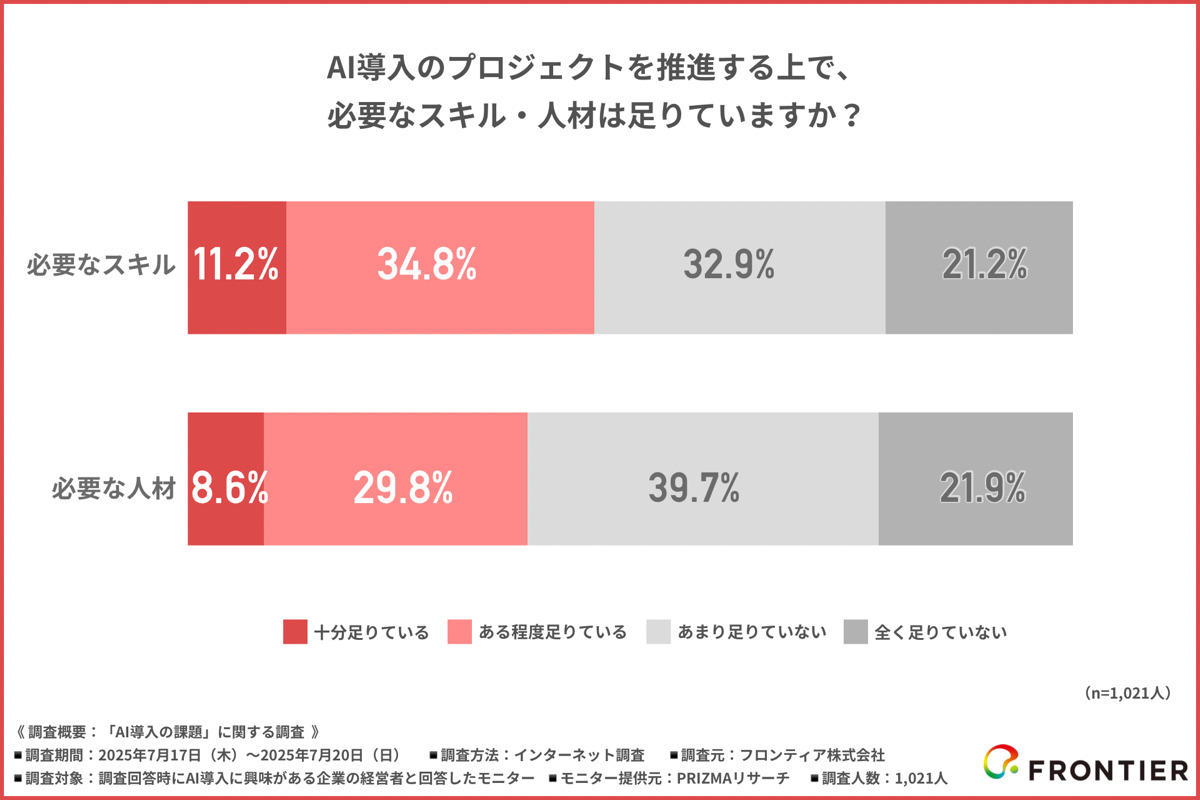 特に「全く足りていない」が2割を超えるという結果から、AI導入を構想・計画しても現場で動かす担い手がいないという本質的な課題を示しています。