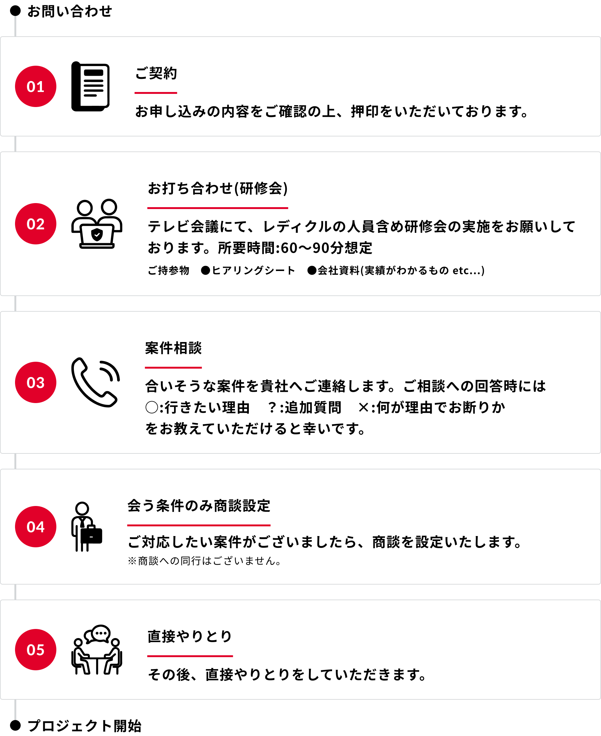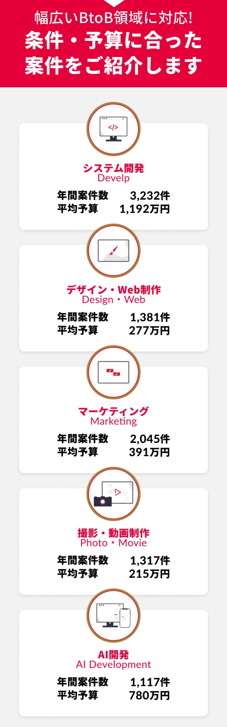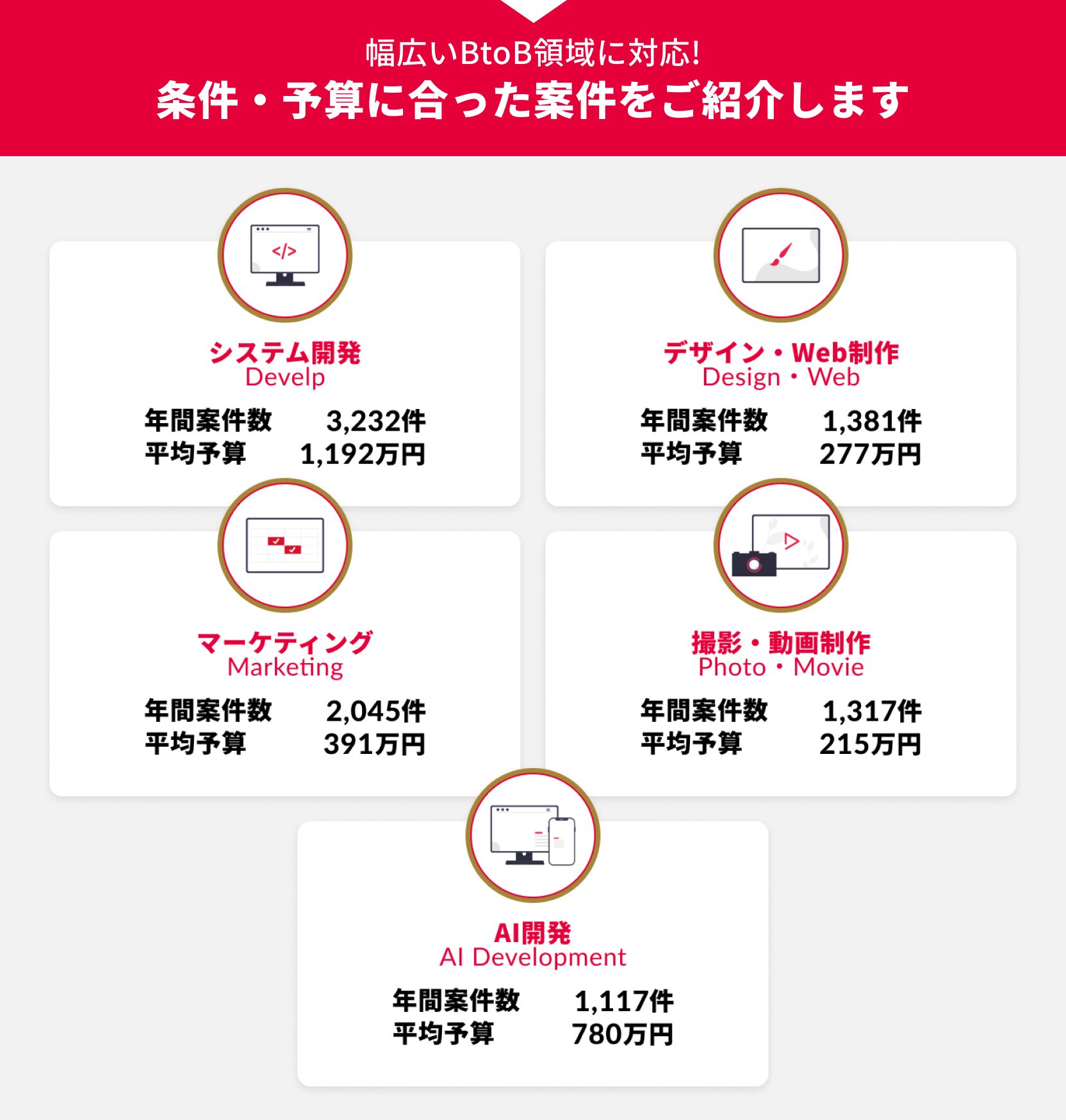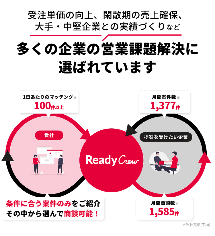 年間取扱予算額1,100億円を突破! 案件を選んで商談できる商談獲得サービス Ready Crew(レディクル) 多くの企業に導入いただいております。 発注企業様の声 「生成AIの社内活用」アウトプットとディスカッションの効率化がミッション サントリーシステムテクノロジー株式会社 業種 IT・インターネット 案件カテゴリ システム・インフラ デザインで切り開く未来への挑戦 大東建託株式会社 業種 建築・不動産・住宅設備 案件カテゴリ 紙デザイン フードロス削減と地域の未来のために、映像で紡ぐプロジェクトの想い 株式会社日本コンベンションサービス 業種 その他 案件カテゴリ 映像 年間取扱予算額1,000億円を突破! 案件を選んで商談できる商談獲得サービス Ready Crew(レディクル) 多くの企業に導入いただいております。 「生成AIの社内活用」アウトプットとディスカッションの効率化がミッション サントリーシステムテクノロジー株式会社 業種 IT・インターネット 案件カテゴリ システム・インフラ デザインで切り開く未来への挑戦 大東建託株式会社 業種 建築・不動産・住宅設備 案件カテゴリ 紙デザイン フードロス削減と地域の未来のために、映像で紡ぐプロジェクトの想い 株式会社日本コンベンションサービス 業種 その他 案件カテゴリ 映像 お問い合わせ 簡単1分! 資料請求