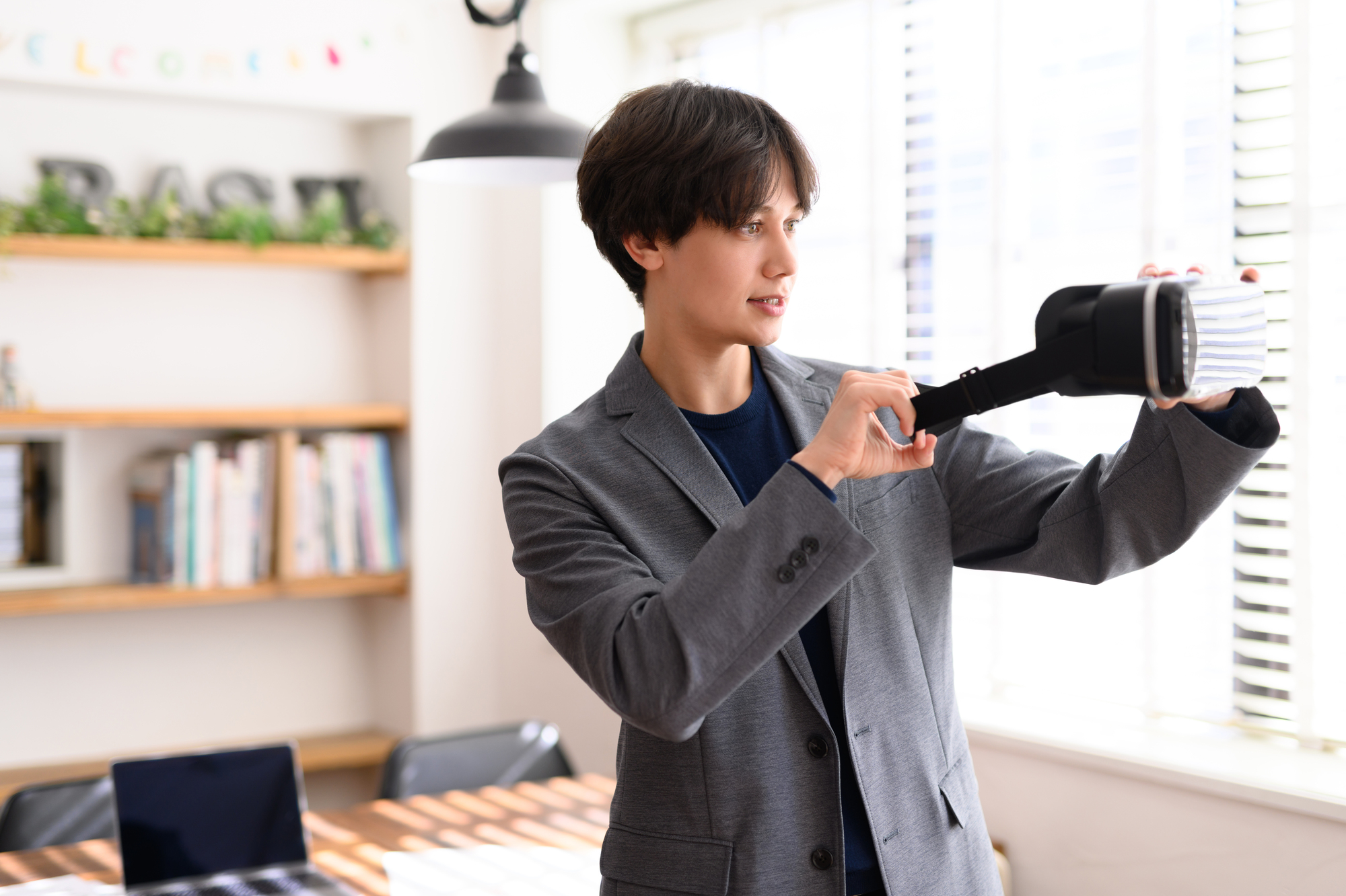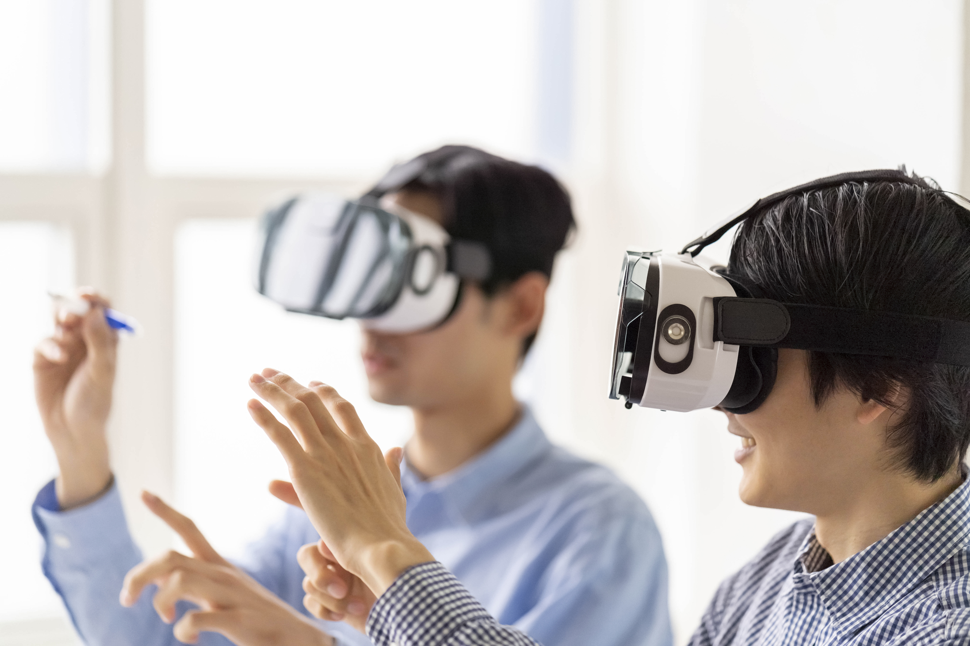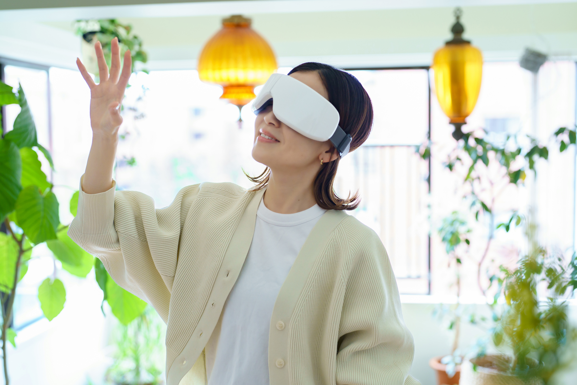 VRとは「Virtual Reality」の略称で、仮想空間を体験する技術のことです。ゴーグルなどの機器を使用して、視覚や聴覚などの情報を全方位の仮想空間内でリアルタイムに提供し、まるで現実にいるかのような感覚を与えてくれます。