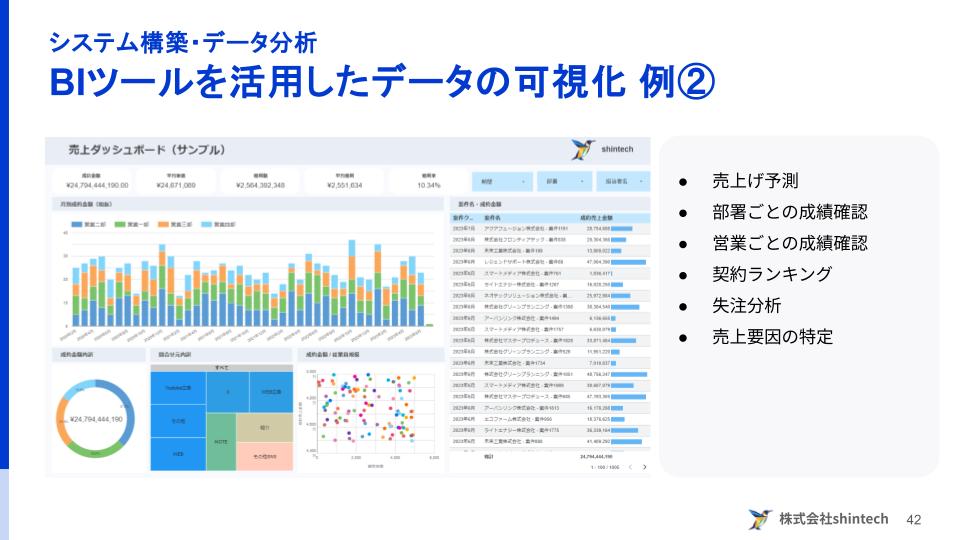 手段としてのツール提案だけでなく、既存の業務整理とデータ整理を行っていただいた上でダッシュボードの構築に着手いただけた。ダッシュボード以外の部分に対する改善のご提案がありがたかった。販管費の圧縮と営業成績の向上の両方を実現することができた。