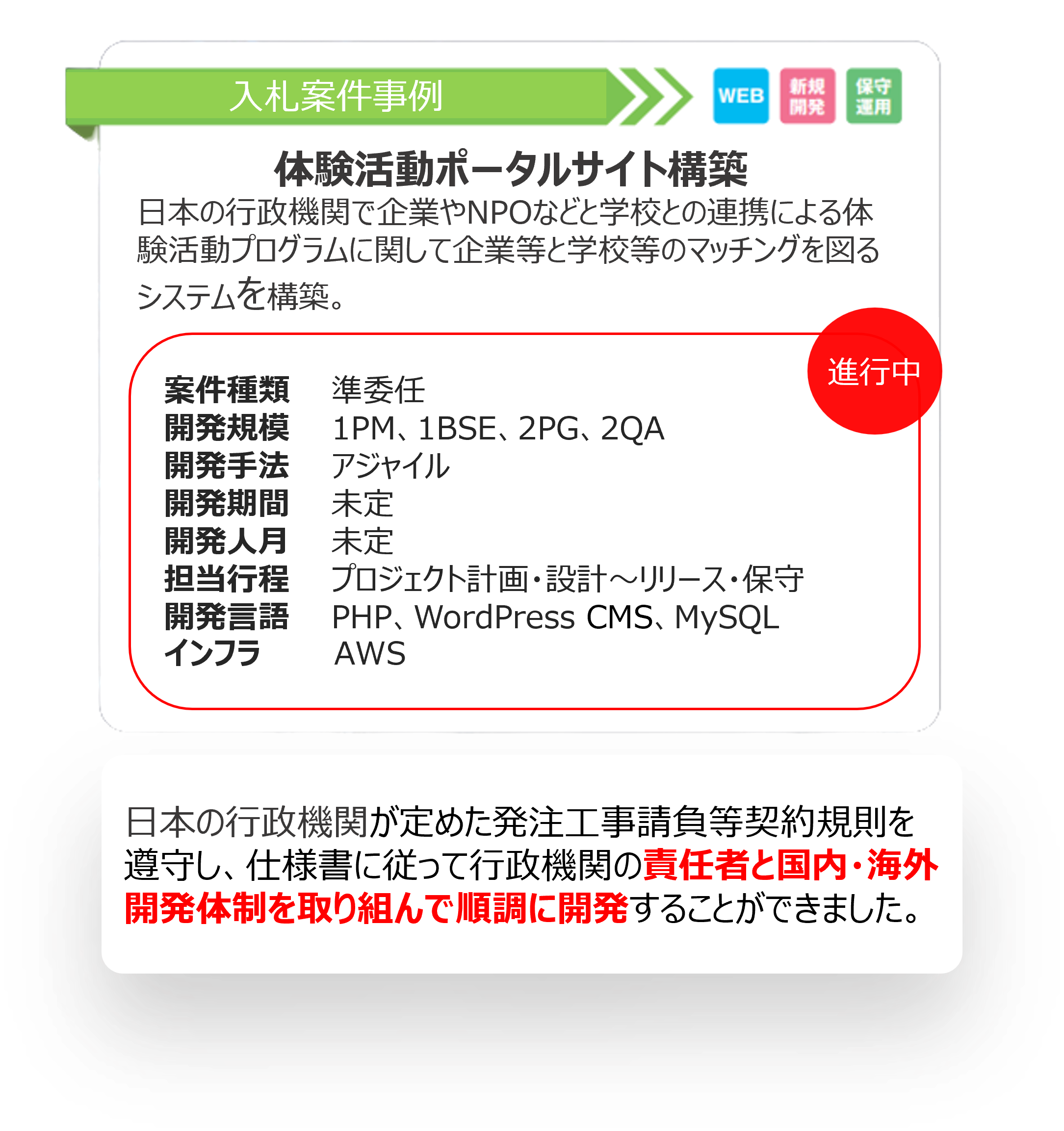 行政機関が定めた発注工事請負等契約規則を遵守し、仕様書に従って行政機関の責任者と国内・海外開発体制を取り組んで順調に開発することができました。