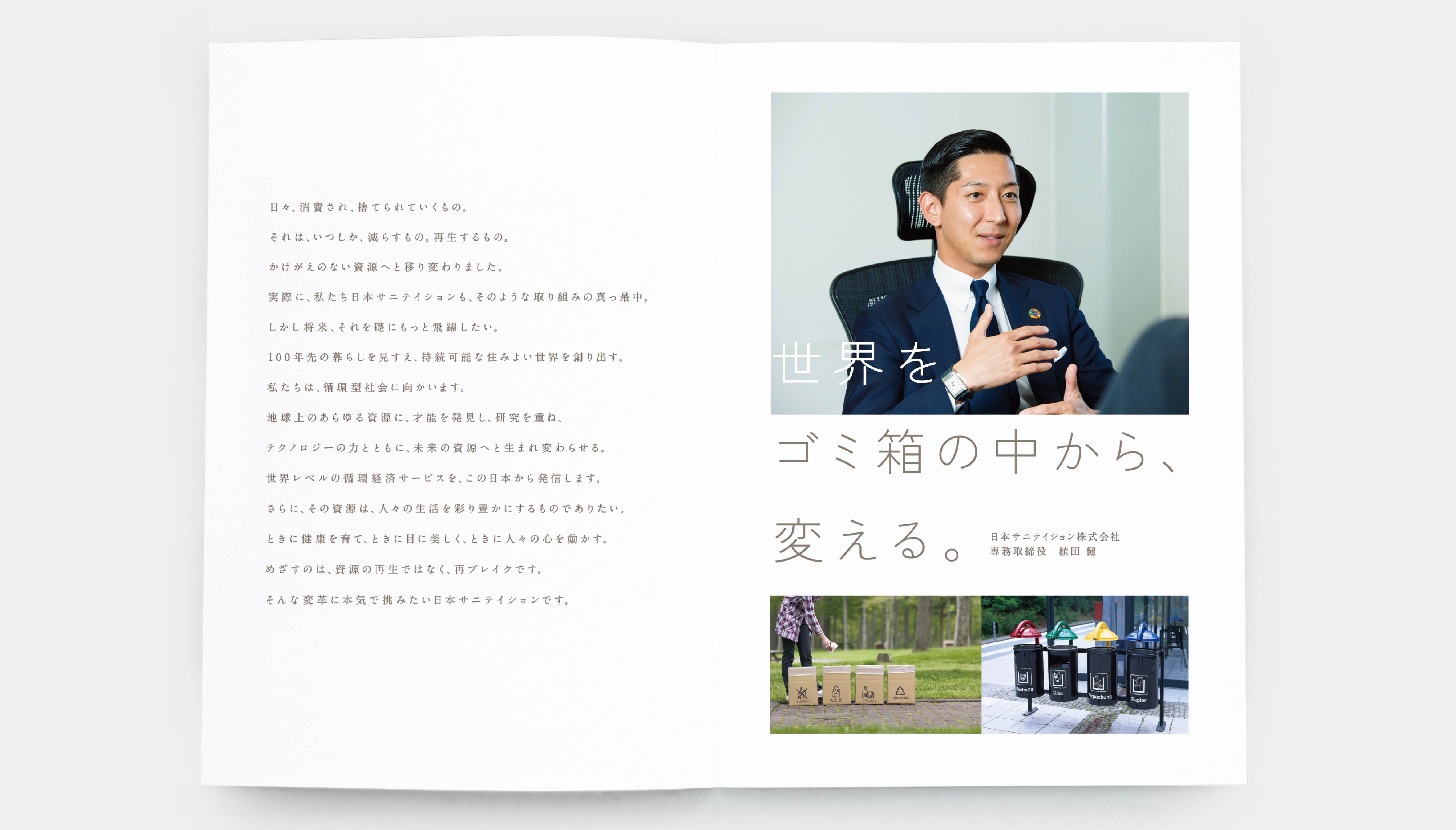 偽善的な環境アプローチの多い同業者の中で、唯一SDGsブーム以前から、日本サニテイション株式会社が取り組んできたサーキュラーエコノミー(持続的循環経済)を前面に押し出したアプローチにシフトする。