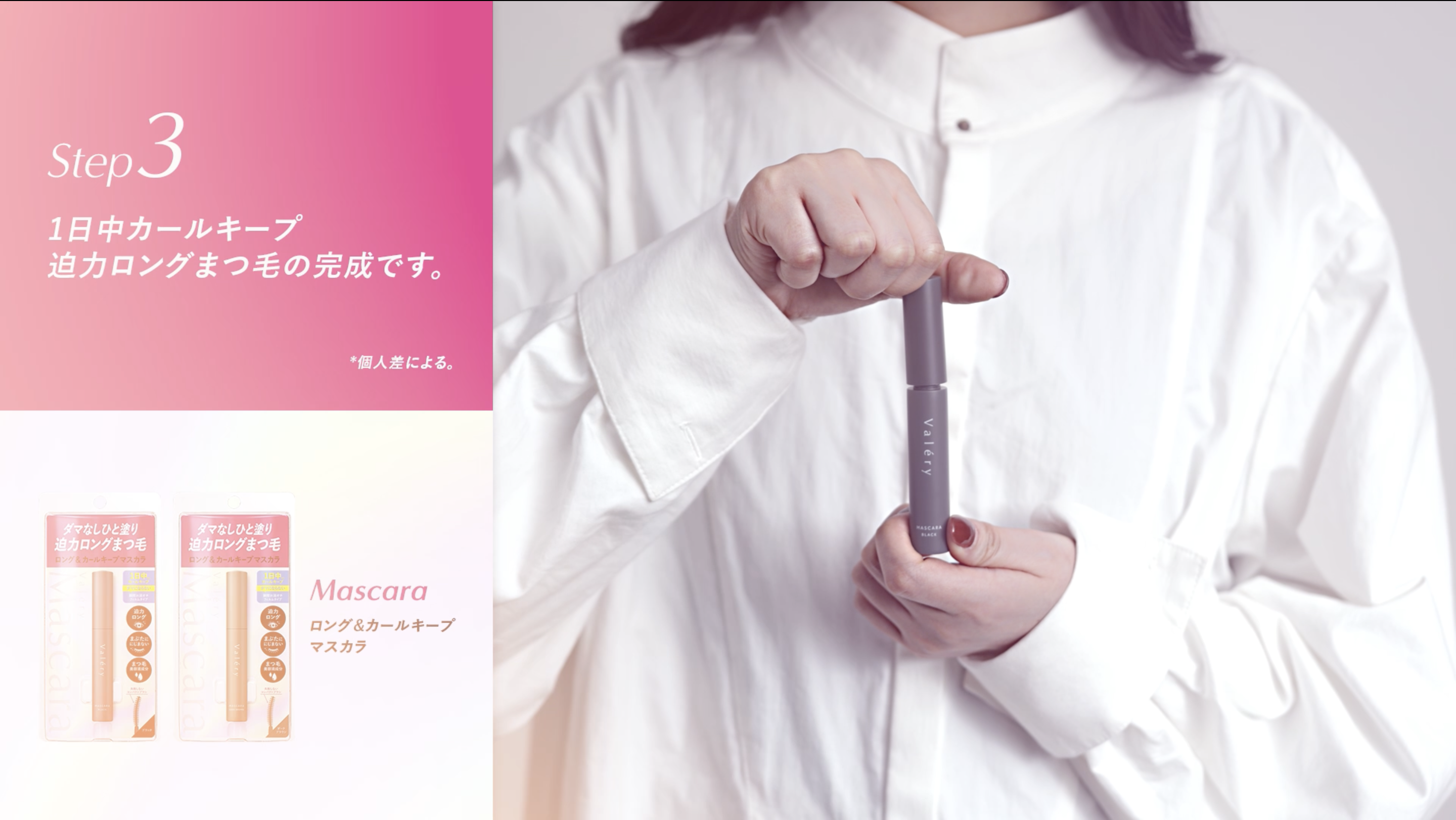 清潔・安全・コンパクトを謳うまつ毛美容液「Valery」シリーズ。商品へのこだわり、どんな想いで開発されたのかをヒアリング。その特徴を捉えながら使い方が簡潔にわかり、最終的にどんな仕上がりになるか、までを動画内で表現した。